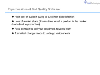 The document discusses software quality testing services provided by Independent Testing Service including software testing, localization and maintenance support. It outlines their technical expertise in areas like programming languages, databases, web servers and testing tools. The document also provides examples of their software testing process and a case study of projects they have worked on.
