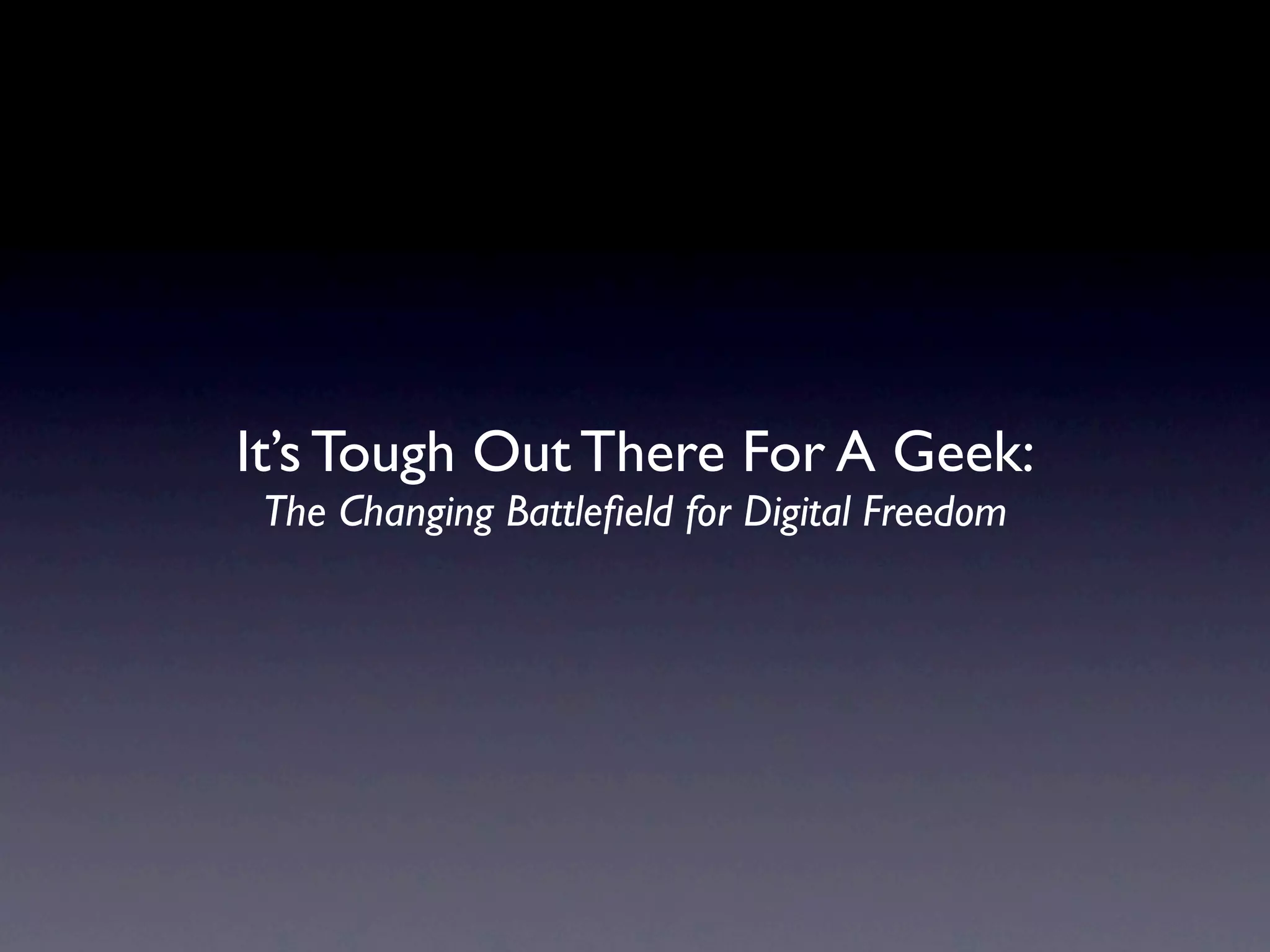 The document discusses the evolving landscape of digital freedom, emphasizing the importance of sharing and remixing cultural content. It highlights trends in broadband internet adoption in the U.S., pointing out a significant increase from 47% to 55% between 2007 and 2008. Additionally, it raises concerns about privacy, interoperability, and the commercialization of the internet in the face of growing cloud computing services.