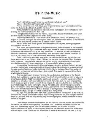 This document is the beginning of a novel titled "It's In the Music". It introduces the main character, Nick Stone, and his flight instructor Jack Noble. Nick is flying Jack's plane as practice when they receive a call from Jack's job as a detective about a disturbing murder. They fly to the crime scene, where they find a young woman brutally tortured and killed in a way resembling a Hieronymus Bosch painting. By examining small details, Nick and Jack deduce that the killer was impatient and angry, and may seek further violent acts to satisfy their rage.
