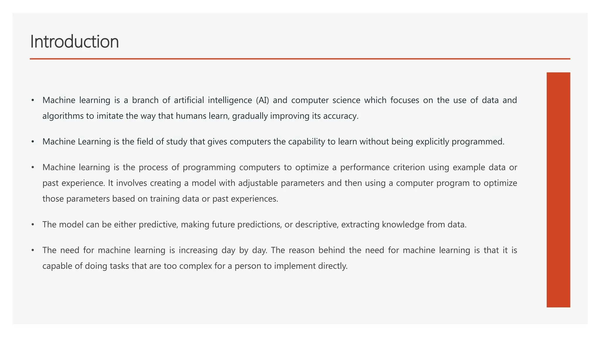 Machine learning is a branch of artificial intelligence that uses data and algorithms to enable computers to learn and improve at tasks without being explicitly programmed. There are three main types of machine learning: supervised learning which uses labeled training data, unsupervised learning which finds patterns in unlabeled data, and reinforcement learning where an agent learns from trial-and-error interactions with an environment. Machine learning is important because it allows automation through data-driven pattern recognition, enables personalization at scale, and accelerates scientific discovery through analysis of massive and complex datasets.