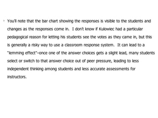 This document discusses the importance of focusing on the student experience when using technology in the classroom rather than the technology itself. It advocates for creating a participatory culture where students' contributions matter and they are supported in creating and sharing their work with others. It also questions who the intended audience is for student work and cites Ben Shneiderman's concept of "Leonardo's Laptop" which emphasized empowering students as creators and contributors.