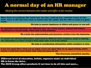 This document discusses the role and responsibilities of an HR manager. It summarizes that an HR manager helps ensure employees meet as scheduled despite real-time issues like bad weather or traffic delays. The HR manager also works to create understanding between employees and ensure information is shared accurately and on time between team members to coordinate work. Finally, the HR manager focuses employee drive and helps overcome unjustified notions of equality by treating employees differently based on their individual levels of education, beliefs and experience.