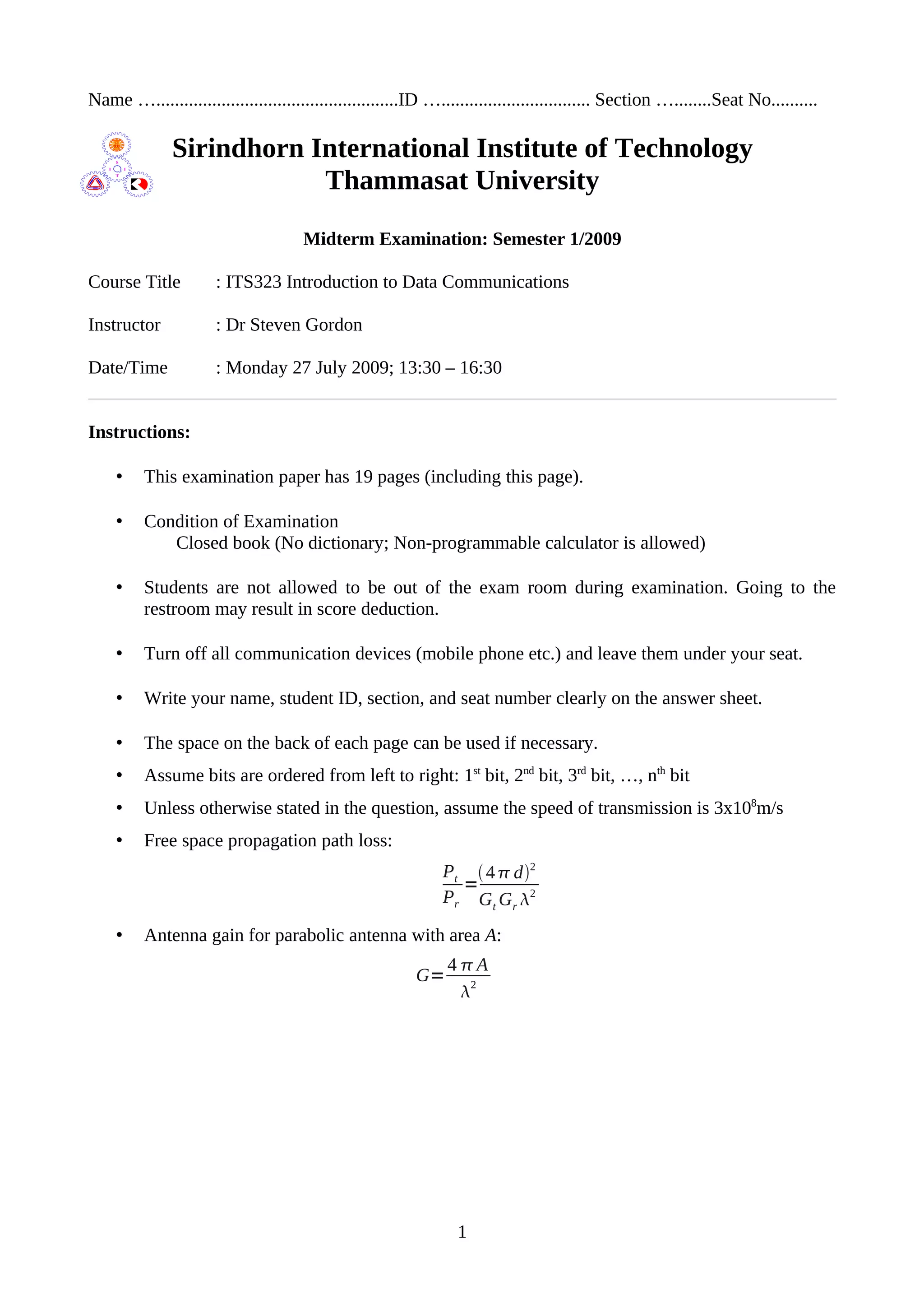 This document contains instructions for a midterm examination in a data communications course. It provides details such as the date, time, duration, and location of the exam. It instructs students on exam policies including remaining in the exam room, turning off devices, and filling out personal details on the answer sheet. The document also provides relevant formulas and assumptions to be used in answering exam questions.