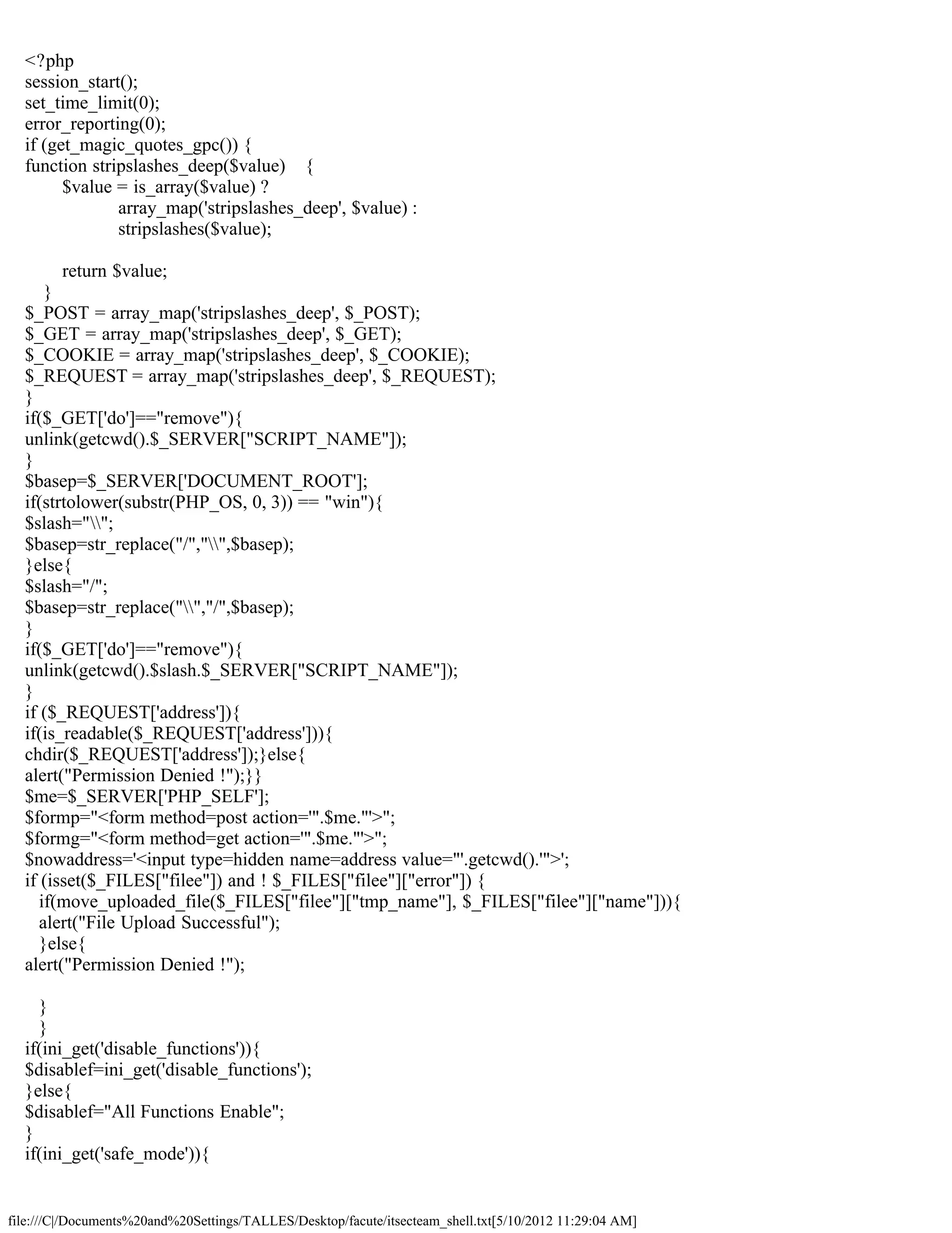 This document contains PHP code for a web shell that provides various functions like file management, command execution, database operations etc. It starts a session, sets time limit and error reporting to 0. It then strips slashes from GET/POST/COOKIE variables. The rest of the code handles different requests like file upload, download, rename, delete etc and displays menus to call these functions. It also shows server information and has about page.