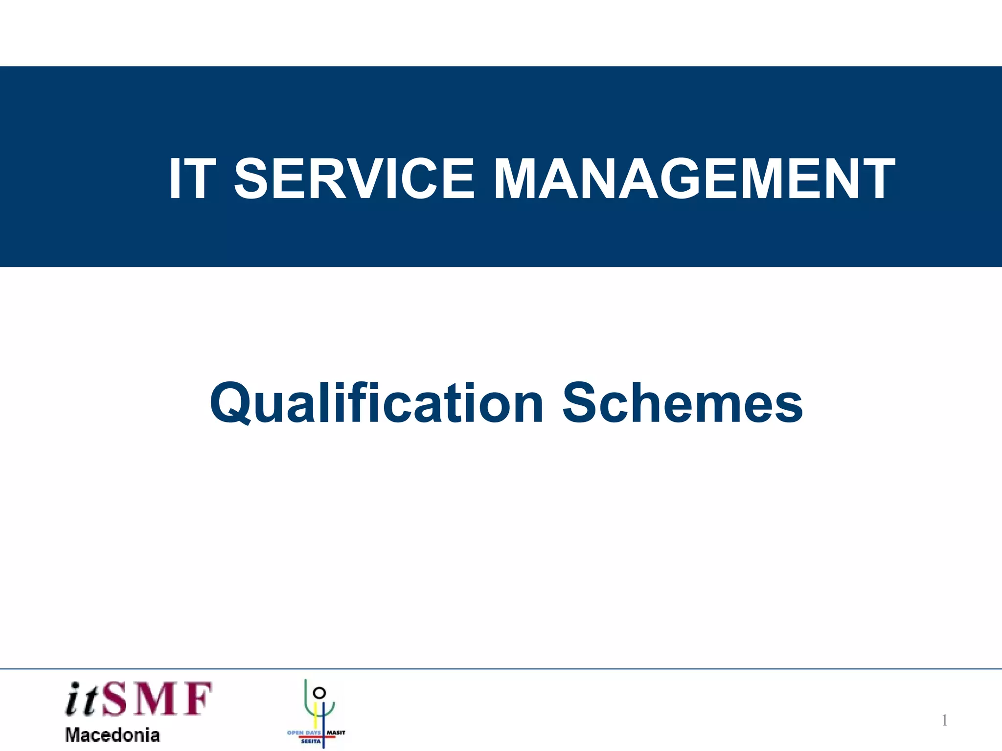 The document discusses various IT service management certification schemes, including: