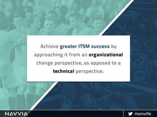 The document discusses the importance of IT Service Management (ITSM) and organizational change in fostering a proactive climate for transformation. Key strategies include creating urgency, developing a clear vision, engaging stakeholders, and ensuring accountability while avoiding a one-size-fits-all approach. Success in ITSM relies on understanding customer needs, effective communication, and embedding change into the organization's culture.