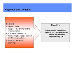 This document discusses addressing the people factor in ITIL implementations. It explains that while ITIL provides guidance on key processes and roles, organizations must determine how to structure their people to support the processes. Two experiences are shared: one where all functional roles were supplemented into ITIL processes, and another where ITIL roles were subsumed into the existing structure. The presentation focuses on how to design an organization model that follows ITIL and places the customer at the core, with dedicated teams for relationship management, planning, application support, and IT services. Process roles are distinguished from functional roles to integrate functions through the processes.