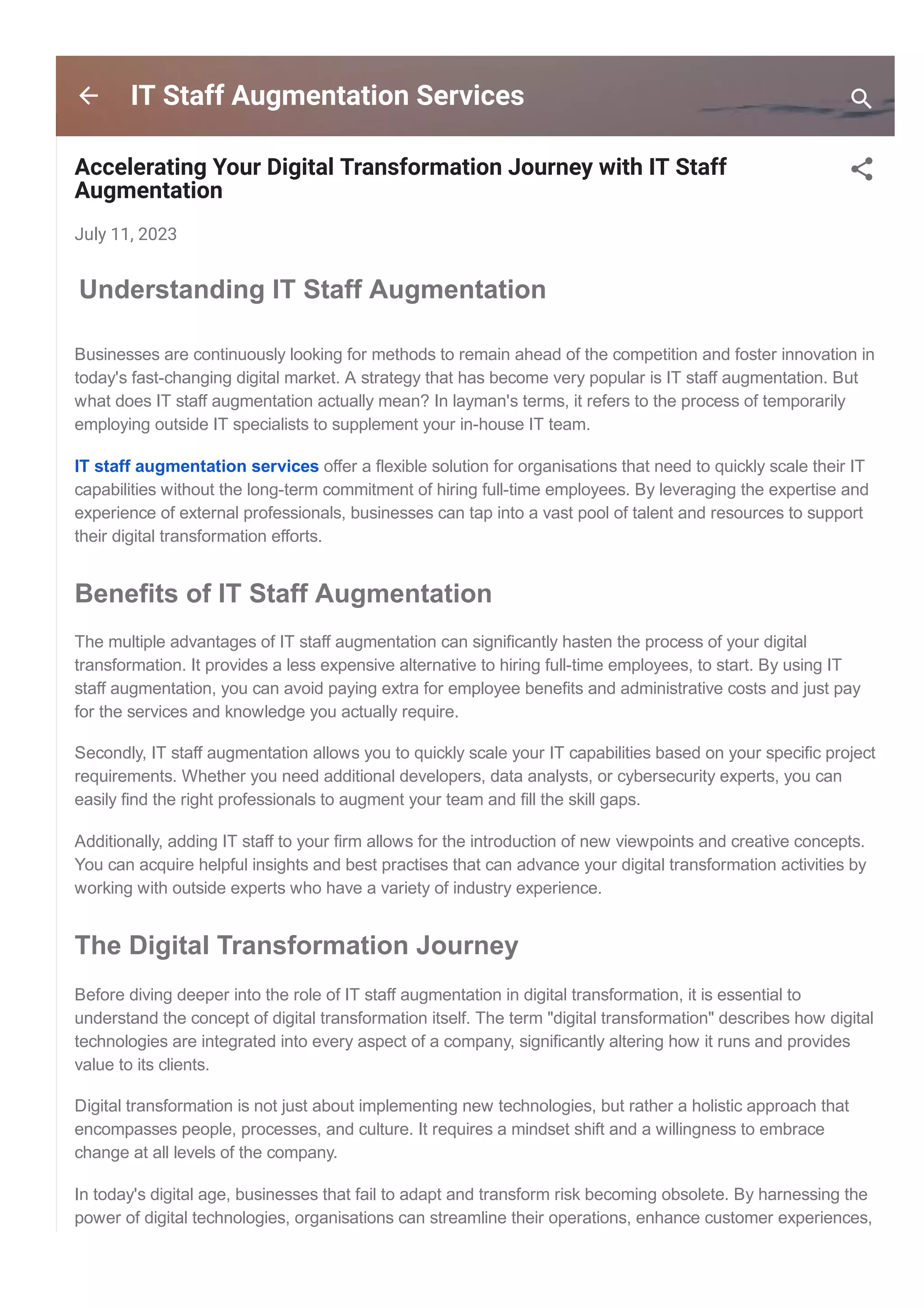 IT staff augmentation allows businesses to temporarily employ outside IT specialists to enhance their in-house team, providing a flexible solution to scale IT capabilities without long-term commitments. This approach helps bridge skill gaps and drive digital transformation by leveraging external expertise and resources. Choosing the right IT staff augmentation partner is crucial, requiring careful evaluation of expertise, cultural fit, and quality assurance.