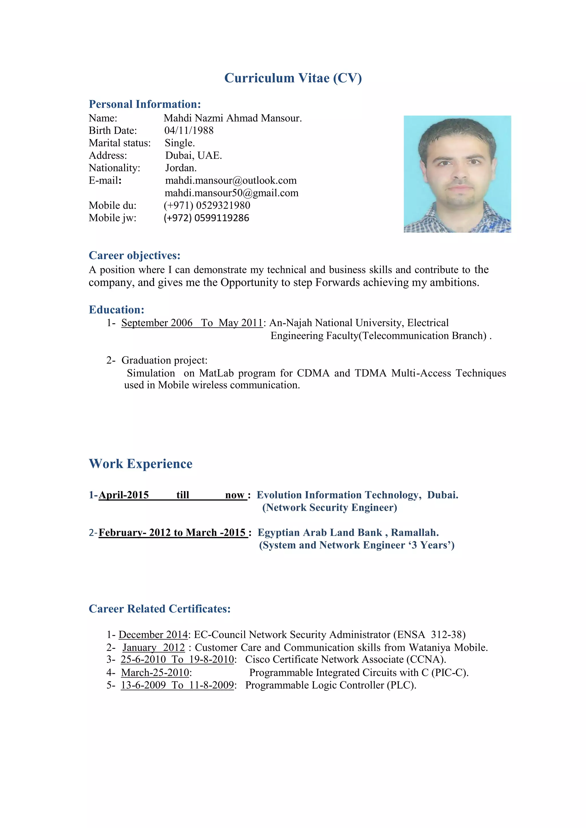 Mahdi Mansour is seeking a position that allows him to utilize his technical and business skills. He has a Bachelor's degree in Electrical Engineering from An-Najah National University. His work experience includes over 3 years as a System and Network Engineer at Egyptian Arab Land Bank and currently as a Network Security Engineer at Evolution Information Technology in Dubai. He has numerous technical certifications including CCNP, CCNA, CEH, RHCSA, RHCE, VMware VCP, and Microsoft MCSE and MCITP.