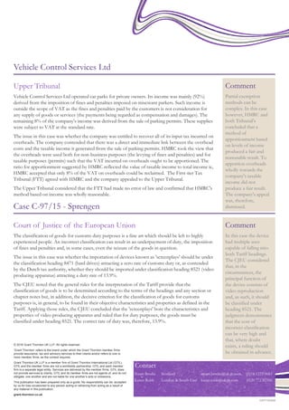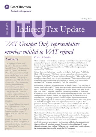 The Scottish Court of Session ruled that within a VAT group, only the representative member is entitled to claim VAT refunds, not the individual members. The Upper Tribunal dismissed an appeal regarding apportionment of input VAT between taxable and non-taxable activities. The Court of Justice ruled that "screenplays" should be classified as video producing apparatus for customs duty purposes based on their objective characteristics.