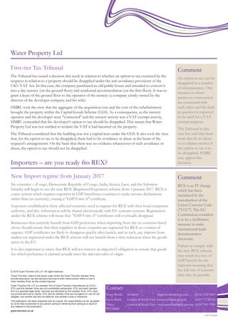 The First-tier Tax Tribunal issued decisions in two cases. In Hotels4U.com v HMRC, the Tribunal followed the precedent from an earlier Supreme Court case and found that Hotels4U.com acted as an agent for hotels, not a principal, so was not subject to the UK Tour Operators' Margin Scheme for VAT. In Water Property Ltd, the Tribunal rejected HMRC's argument that an option to tax should be disapplied due to anti-avoidance rules, as there was no evidence of tax avoidance. The Tribunal also alerted importers that six countries will start using the new EU Registered Exporters scheme from January 2017, which could impact their ability to claim customs duty reductions if their