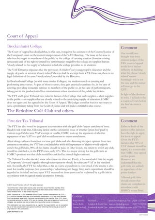 The First-tier Tax Tribunal issued a controversial decision ruling that VAT is due on the full consideration received by Adecco UK Ltd and others for supplying temporary workers to clients, contradicting an earlier similar case. The Court of Appeal decided to refer the Brockenhurst College case on whether supplies of catering and performances are 'closely related' to education to the European Court of Justice for guidance. The FTT also ruled in the golf clubs unjust enrichment case that 90% of VAT claims made should be repaid, constituting a major victory for the golf clubs against HMRC's position.