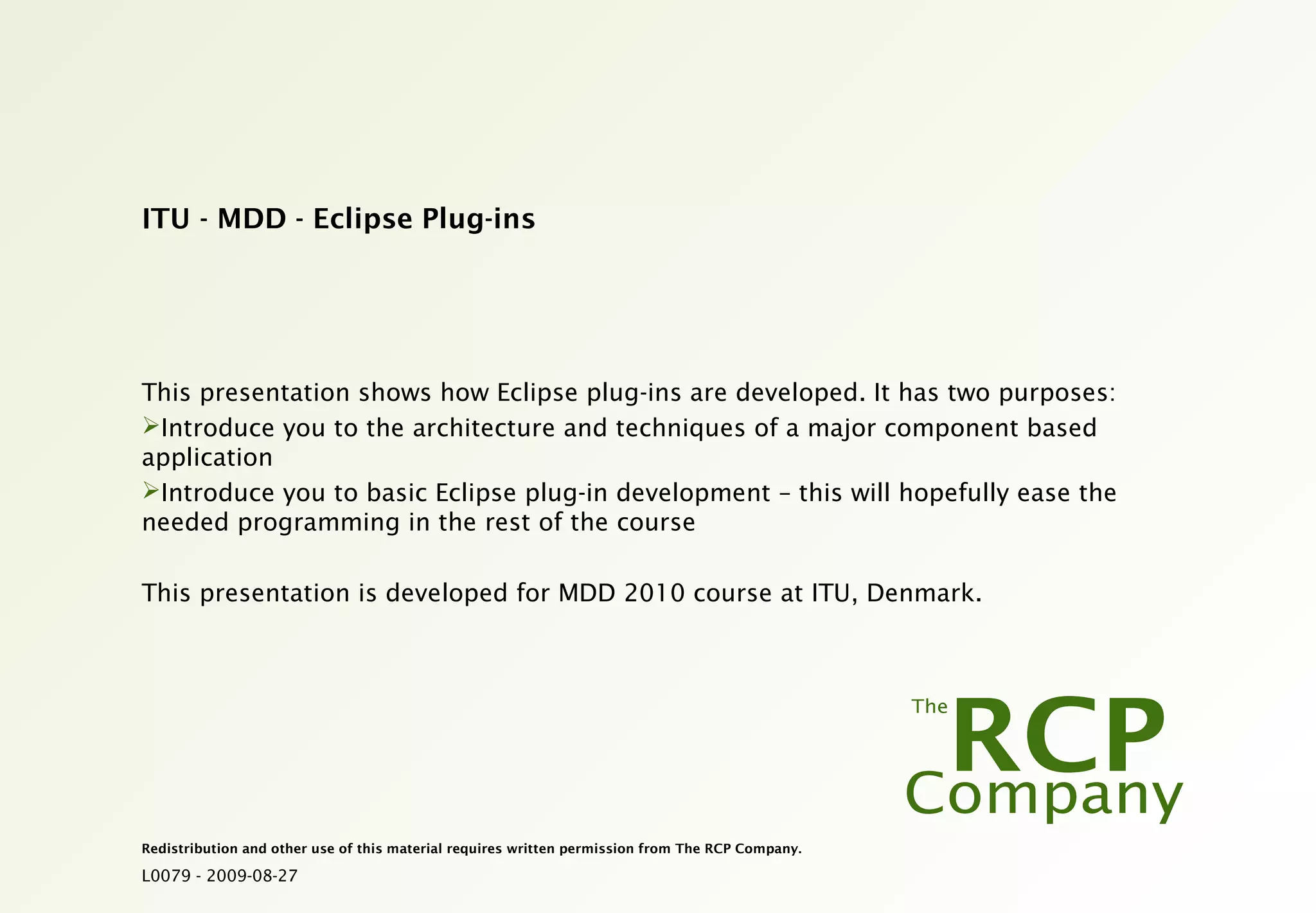 This document outlines the development and architecture of Eclipse plug-ins, particularly for a course at ITU Denmark. It discusses the essential components of the Eclipse platform, including its flexible architecture based on plug-ins, and introduces various topics like the Standard Widget Toolkit (SWT) for user interface development. Additionally, it emphasizes the organizational structure of Eclipse projects and their collaborative nature across multiple teams and regions.
