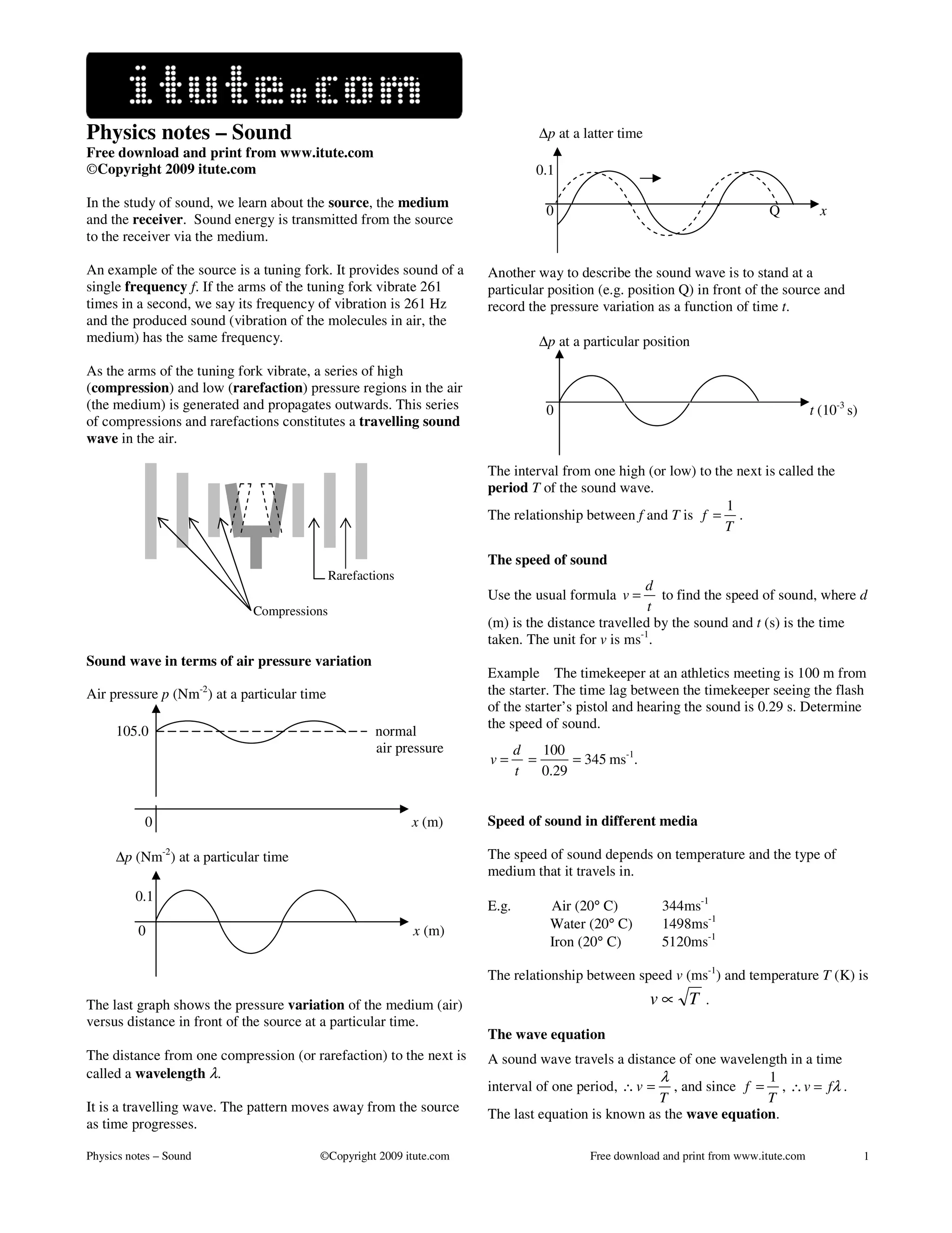 The document discusses sound waves and their properties. It defines key terms like frequency, wavelength, amplitude, and speed of sound. It explains that sound is a longitudinal wave that propagates through a medium by generating regions of high and low pressure. The speed of sound depends on the temperature and medium, and follows the relationship that speed increases with increasing temperature. Sound intensity describes the amount of sound energy arriving at a surface over time, and decreases with the square of the distance from the source.