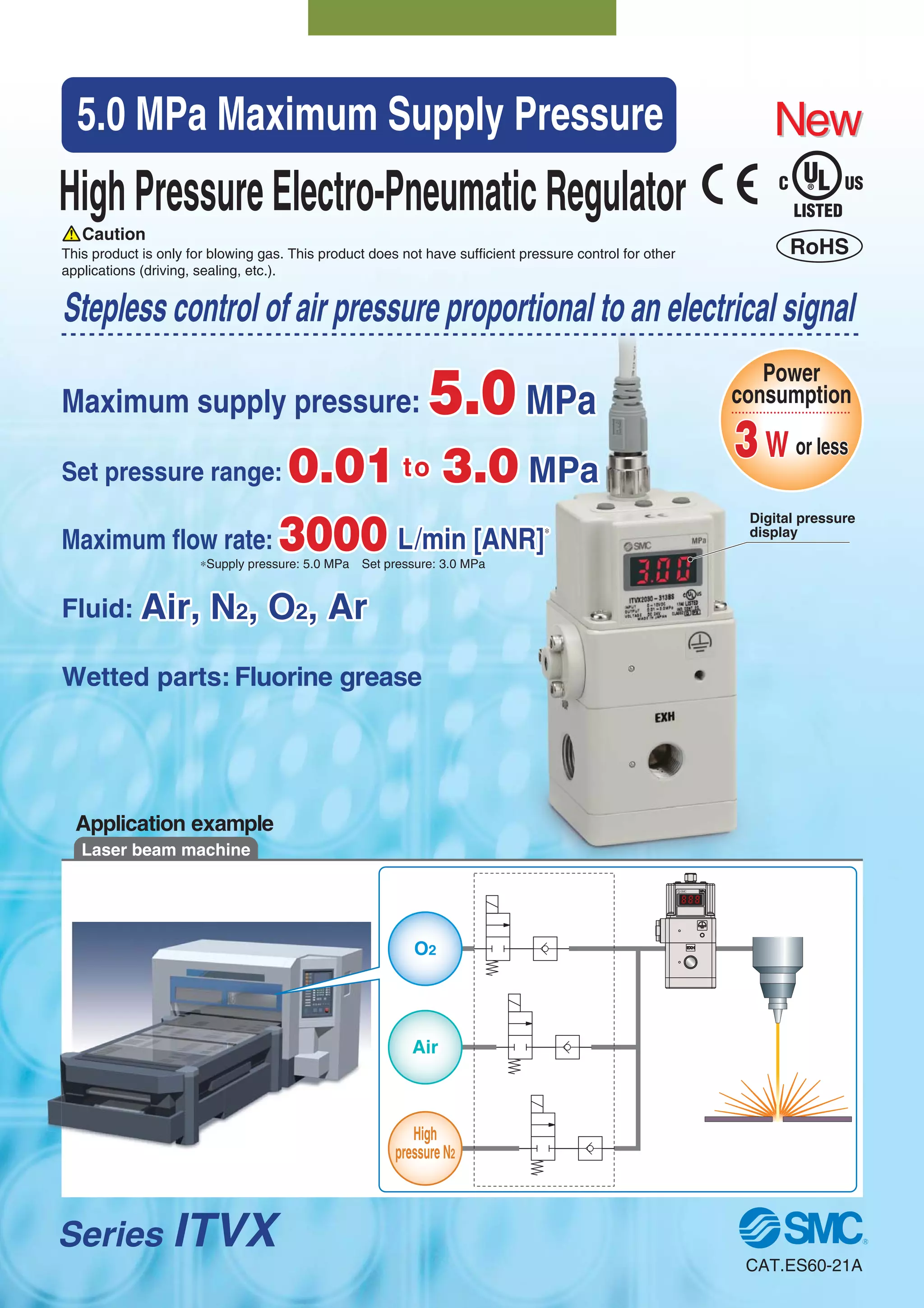 2. The regulator can control air, nitrogen, oxygen, or argon pressure from 0.01 to 3 MPa with a maximum supply pressure of 5 MPa. It has analog and switch outputs for monitoring.