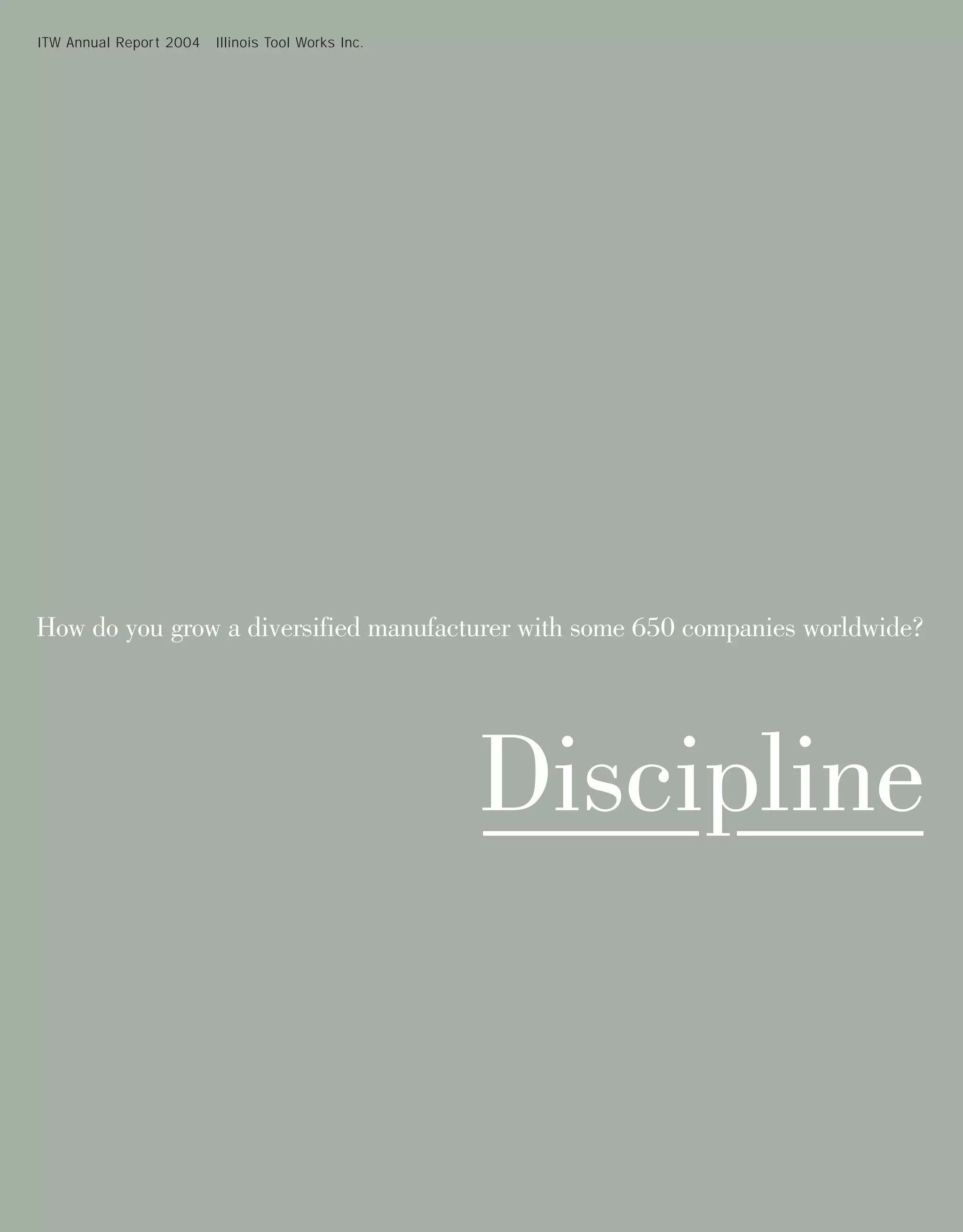 The document is Illinois Tool Works' (ITW) 2004 annual report. It discusses how ITW grows its diversified manufacturing business through disciplined focus on growing base revenues, making profitable acquisitions, and improving operating margins. ITW employs around 49,000 people across 650 decentralized business units in 45 countries. The report provides details on ITW's financial performance in 2004 and discusses its strategies for revenue growth, including focus on key industries like construction and automotive, and acquisitions that expand its product offerings and geographic reach.