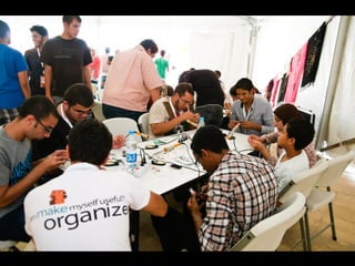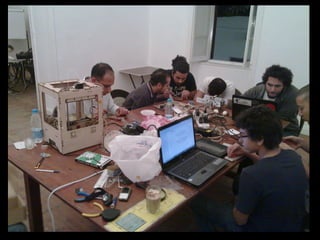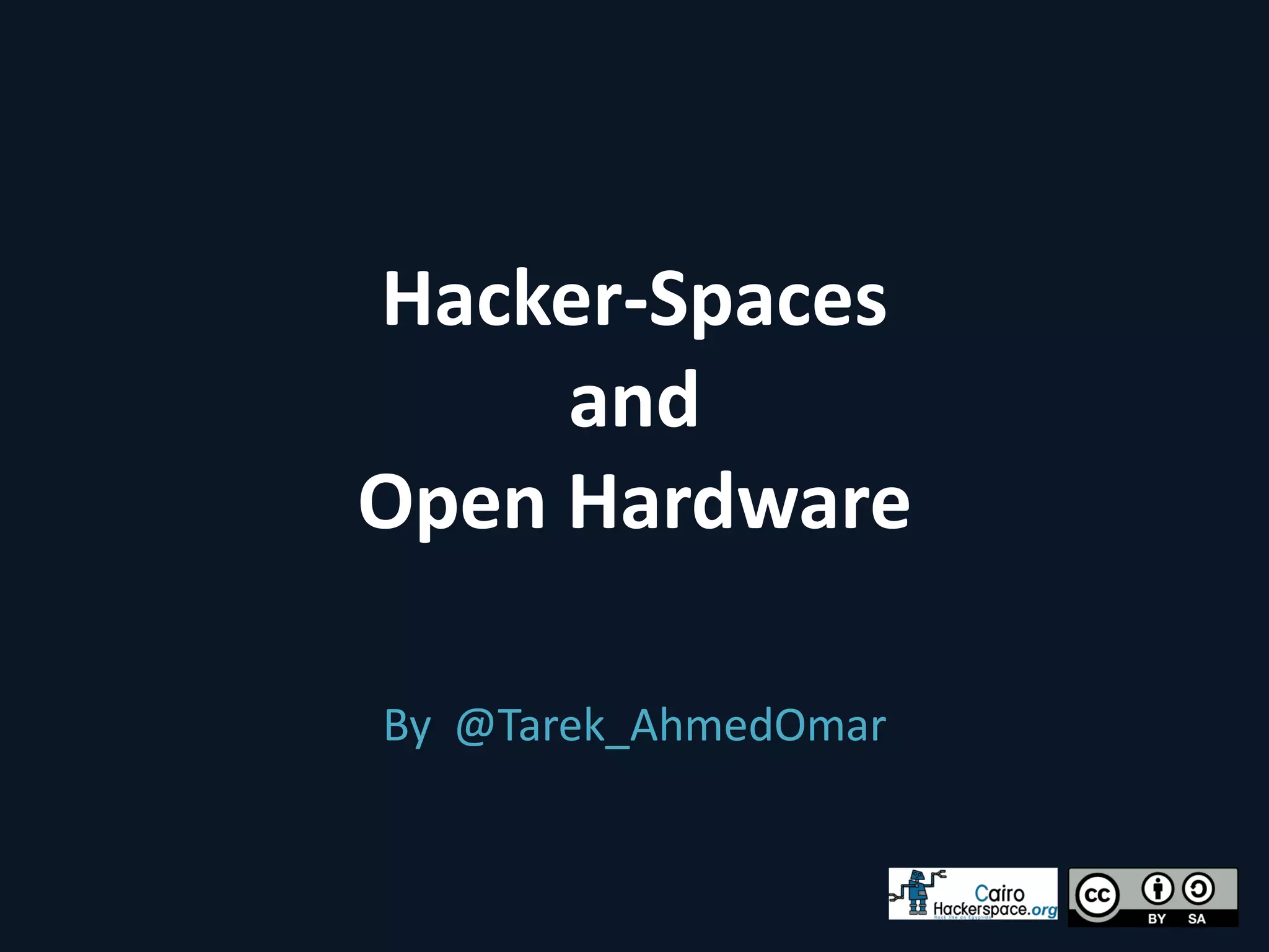 This document discusses hacker-spaces and open hardware. It defines a hacker as a "maker, geek, coder, crafter, nerd, artist" who is welcome in hacker spaces. It describes hacker spaces as places for collaboration on projects both big and small, ranging from arts and crafts to science and technology. Several examples of hacker spaces are provided, including Noisebridge which has facilities like an electronics lab, darkroom, library, craft lab, and more advanced tools.