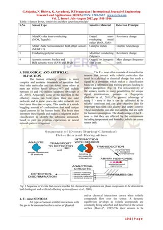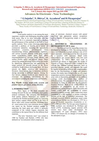 The document summarizes advances in electronic nose technologies. It discusses the historical development of electronic noses from the 1950s to present. It describes the four main sensor types used in electronic noses: metal oxide semiconductors, metal oxide semiconductor field-effect transistors, conducting polymer sensors, and piezoelectric acoustic sensors. Each sensor type is explained in terms of its sensitive material, detection principle, and factors that influence selectivity and sensitivity. The document provides an overview of electronic nose technologies and the sensor types commonly used.