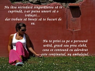 Documentul încurajează auto-îngrijirea și iubirea de sine, subliniind importanța acceptării propriei persoane și a bucuriei în viață. Se evidențiază alegerea între fericire și tristețe, subliniind că mintea este un magnet pentru ceea ce gândim și dorim. Autorul îndeamnă cititorul să se concentreze pe amintiri frumoase și să lupte pentru idealurile sale.
