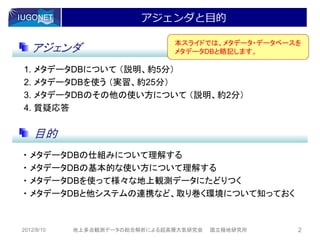 本スライドでは、メタデータ・データベースを アジェンダ メタデータDBと略記します。 1. メタデータDBについて (説明、約5分) 2. メタデータDBを使う (実習、約25分) 3. メタデータDBのその他の使い方について (説明、約2分) 4. 質疑応答 目的 ・ メタデータDBの仕組みについて理解する ・ メタデータDBの基本的な使い方について理解する ・ メタデータDBを使って様々な地上観測データにたどりつく ・ メタデータDBと他システムの連携など、取り巻く環境について知っておく 2012/8/10 地上多点観測データの総合解析による超高層大気研究会 国立極地研究所 2