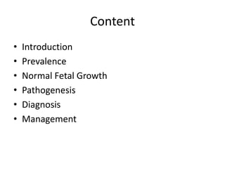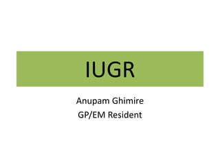This document provides an overview of intrauterine growth restriction (IUGR). It defines IUGR as fetuses with an estimated fetal weight below the 10th percentile. The prevalence of IUGR is 3-10% of pregnancies and carries high risks of perinatal mortality and morbidity. Causes of IUGR include fetal, placental and maternal factors. Diagnosis involves serial ultrasounds to monitor fetal growth and Doppler studies of blood flow. Management focuses on treating any underlying conditions, fetal monitoring, and timely delivery once the fetus is mature. Strict surveillance of at-risk newborns is also needed due to complications of IUGR.