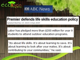 The document discusses experiential learning and its benefits over conventional teaching methods. It notes that only 23-25% of management graduates are employable due to a focus on theoretical study rather than practical skills. Experiential learning involves learning through experience and reflection. A 3-day off-site experiential learning program is proposed that focuses on self-confidence, teamwork, and survival skills through activities in nature. This aims to develop skills like leadership, communication, and problem solving to increase student employability. The program is conducted by an experiential learning company that specializes in outdoor education and community involvement.