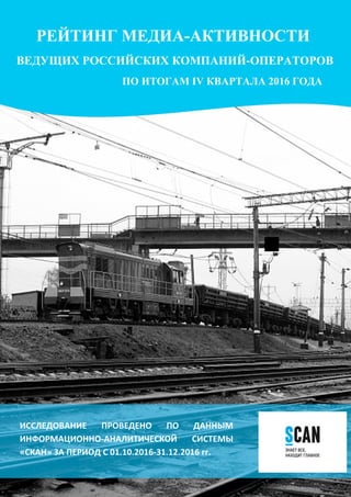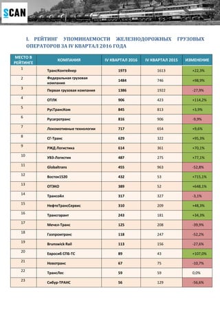 В документе представлен рейтинг медиа-активности ведущих российских грузовых операторов за IV квартал 2016 года на основе данных информационно-аналитической системы «Скан». Топ-3 компаний по упоминаемости составляют Трансконтейнер, Федеральная Грузовая Компания и Первая Грузовая Компания, с заметным увеличением упоминаемости у большинства операторов. Документ включает подробные данные по изменению упоминаемости по сравнению с IV кварталом 2015 года.