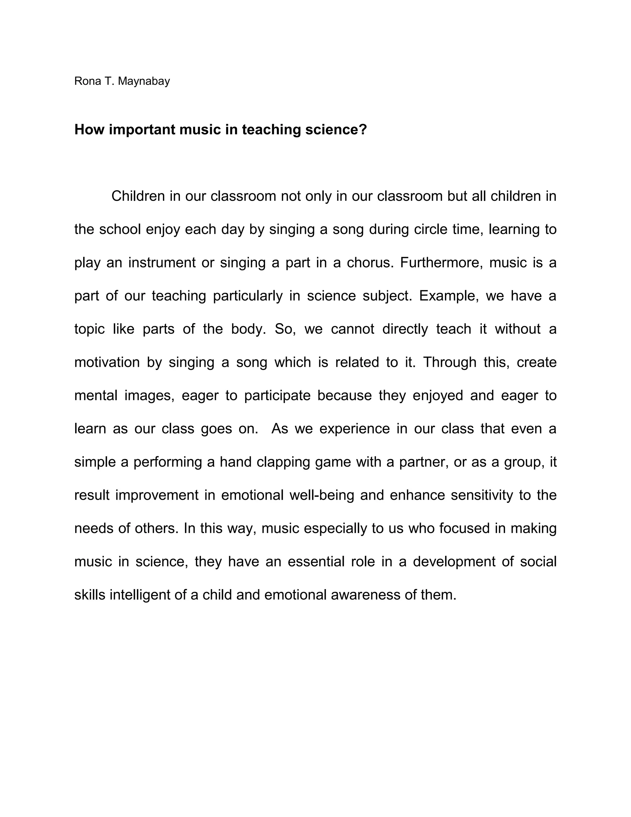 Children enjoy music during daily activities like singing songs, playing instruments, and participating in choruses. The document discusses how music is integrated into teaching science topics to motivate students and help them form mental images. Performing simple music activities in groups has been shown to improve emotional well-being and social skills. When teaching science, the document recommends applying science concepts through various activities including music, art, literature, experiments, food experiences, movement, field trips, and play to develop students' intellectual, social, and emotional skills in a holistic manner.