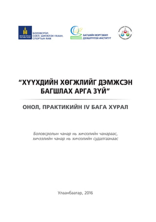БАГШЛАХ АРГА ЗҮЙ” СЭДЭВТ ОНОЛ, ПРАКТИКИЙН IV БАГА ХУРАЛ -94- ДӨРӨВ.СУДЛАГДАХУУНДСУУРИЛСАН ХИЧЭЭЛИЙНСУДАЛГАА БАГАБОЛОВСРОЛ Товч агуулга Цөм хөтөлбөр хэрэгжсэнээр багш бид сурах бичиг, хөтөлбөр агуулгаа судлан өөрийн сонирхол мэдлэг чадвараа ашиглан хүүхэд бүрийг хөгжүүлэхийг зорьсон. Багш миний хувьд хөдөө орон нутгийн эцэг эхчүүд улирлын эхэнд хүүхдээ авчирч орхиод мартдаг сургууль ангиас зохиосон аливаа ажилд оролцдоггүй, хүүхдийн хөгжлийг анхаардаггүй байдлыг багасгаж тэдний сонирхол идэвхийг өрнүүлж хүүхдийн сурлага, хүмүүжил хөгжилд эцэг эхийн оролцоо хэрэгтэй гэдгийг давхар мэдрүүлэхийг бодсон. Хүүхдийг дуурайн бичих арга зүйгээр хөгжүүлэхийн тулд эцэг эх гэр бүлийг хамтад нь сургаж хөгжүүлж сэтгэл зүйн орчныг бүрдүүлэх нь чухал ач холбогдолтой байсан. Мэдээлэл технологийн эрин зуунд амьдарч байгаа хүүхдүүд ном уншихаа байсан тул тэднийг номд дурлуулж, номтой нөхөрлүүлж, номыг шимтэн уншиж, ирээдүйд би зохиолч болно гэсэн итгэлтэй болгоход олон төрлийн соёл хүмүүжлийн ажлыг зохиож энэ ажилдаа эцэг эхээ татан оролцуулсан нь зөв алхам болсон. Бид хөтөлбөрийн дагуу хичээлийн цагаараа хүүхэд бүрийг хөгжүүлэх боломж хомс байсан. ХГСҮА хичээлээр сурсан мэдсэнээ өргөжүүлэн сонгож судлан хүүхэд бүрээ хөгжүүлэх боломж бий болсон. Багш миний судалж туршсан дуурайн бичих арга зүйгээр хүүхэд бүрээ хөгжүүлсэн туршлага мэргэжил багш нарт маань ажилдаа тусган авах санаа болоосой гэж бодож байна.
