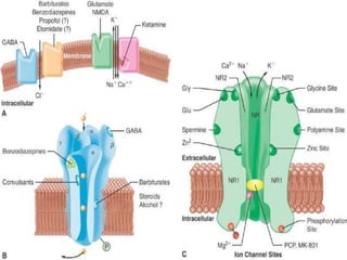 The document discusses ideal properties of intravenous anesthetics and summarizes the pharmacokinetics and pharmacodynamics of several commonly used IV anesthetics including barbiturates, propofol, etomidate, ketamine, benzodiazepines, and dexmedetomidine. It outlines desirable traits such as rapid onset and offset of action, minimal cardiovascular and respiratory depression, and lack of adverse effects. Each drug's mechanism of action, dosing, metabolism, indications, contraindications, and side effects are briefly described.