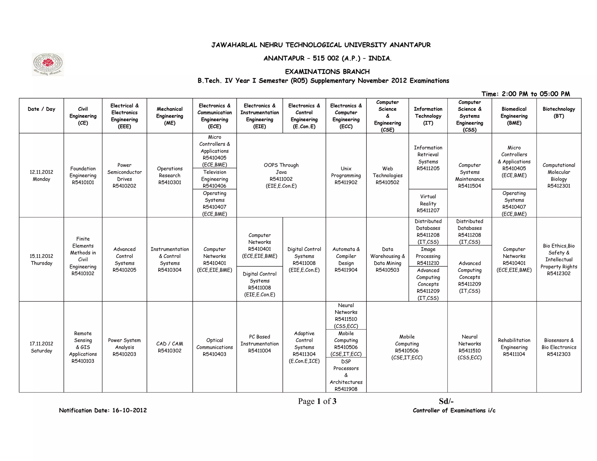 1) The document provides the timetable for the B.Tech IV Year I Semester (R05) Supplementary November 2012 Examinations at Jawaharlal Nehru Technological University Anantapur.