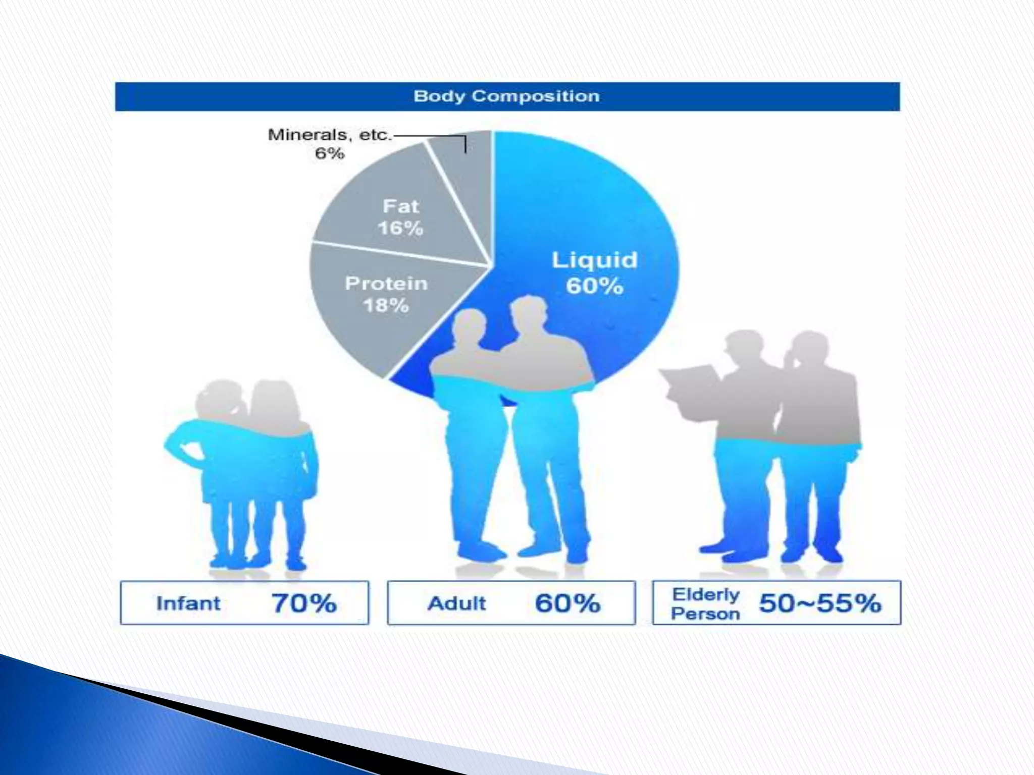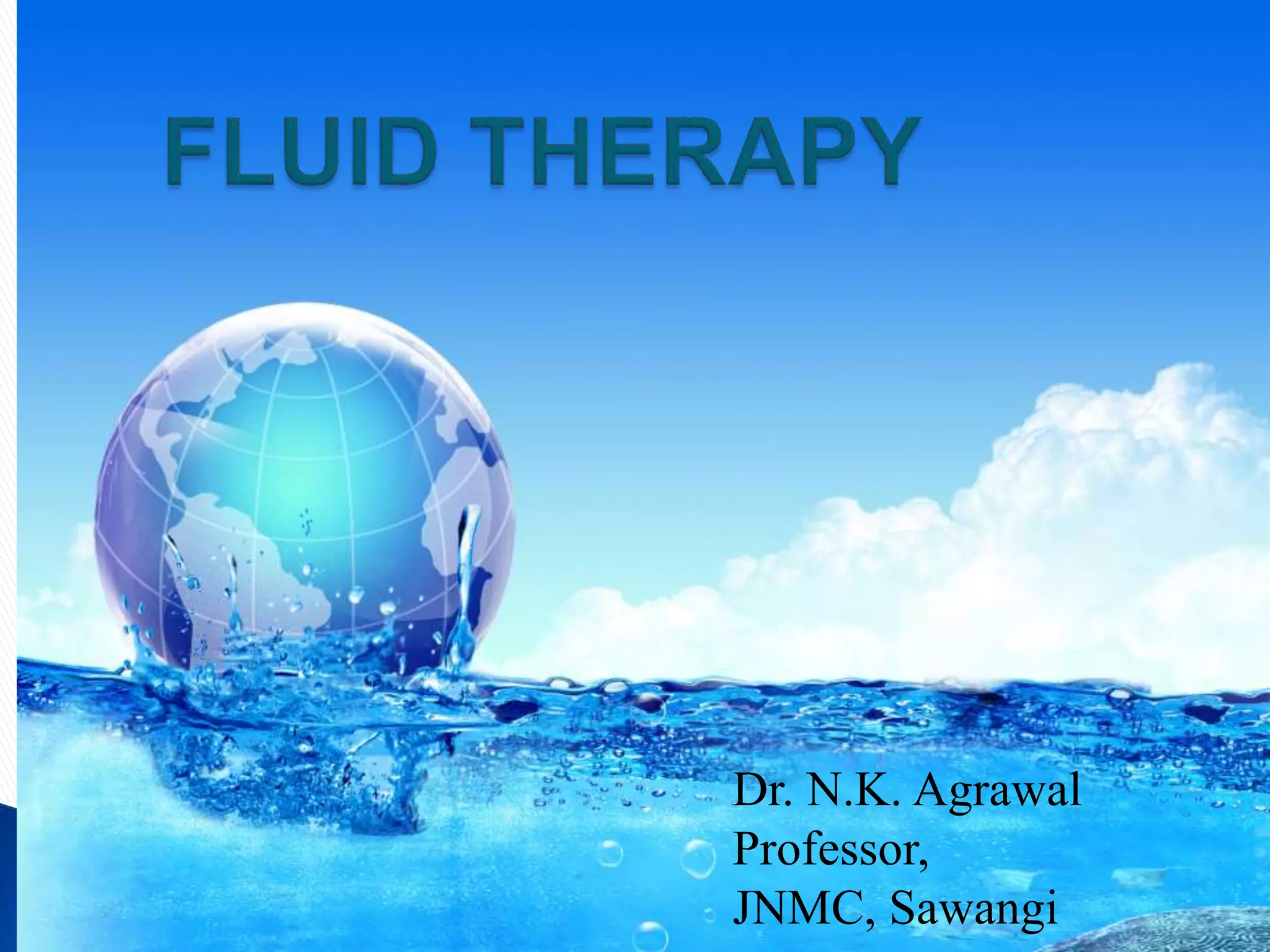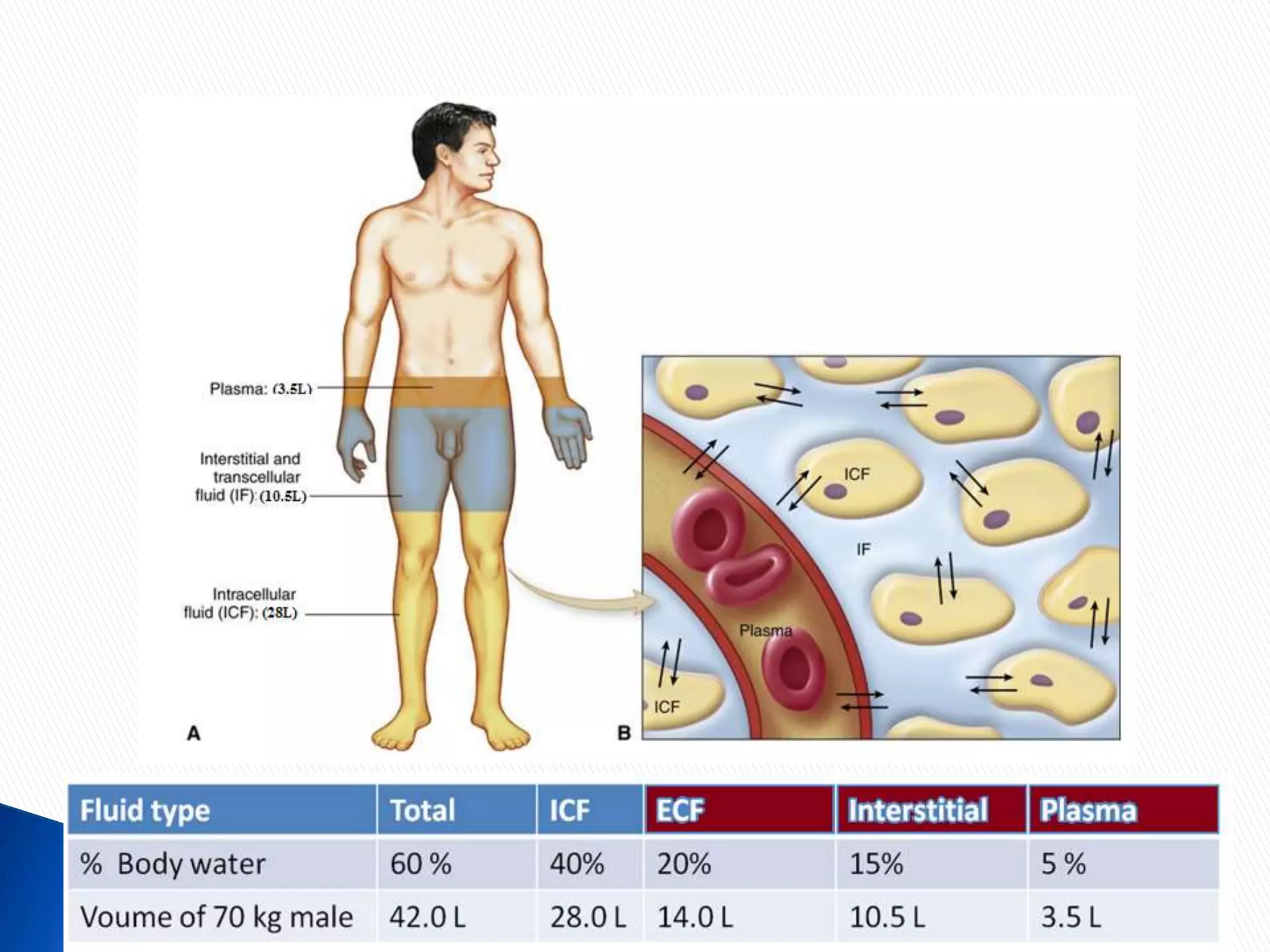 This document discusses the composition and distribution of fluids in the human body. It notes that 60% of the body is fluid, with 40% being intracellular fluid and the remaining extracellular fluid distributed between interstitial fluid and intravascular fluid. It provides details on fluid requirements, losses, electrolyte concentrations in different compartments, and types of intravenous fluids including crystalloids and colloids. The document emphasizes the importance of fluid balance and maintenance of adequate hydration and outlines factors to consider for fluid management in pre-operative, intra-operative, and post-operative settings.