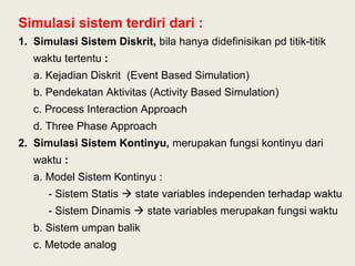 1. The document discusses discrete event simulation and its components. Discrete event simulation models systems as they change states at discrete points in time. It involves events, state variables, event lists, and statistical counters.