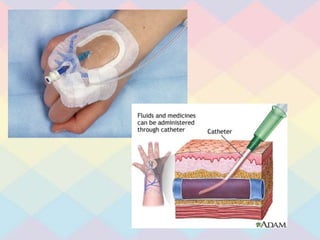 Peripheral IVs involve inserting a catheter into a small distal blood vessel and are not sterile procedures, while central lines involve inserting a catheter into a large vessel near the heart and require sterile insertion due to long-term or frequent infusions of medications that could harm smaller veins. Central lines like PICC lines, ports, and subclavian lines also require careful care and maintenance to prevent infections and clots.