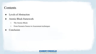 The document discusses the development of a modular framework for validating autonomous vehicles (AVs) using accident data, emphasizing the classification and parameterization of scenarios. It introduces an atomic block framework and outlines methods for scenario selection, execution, and assessment metrics, including collision detection and high-risk moment detection. The end result is a comprehensive database of scenarios sourced from real accident reports that facilitate AV testing and safety improvements.