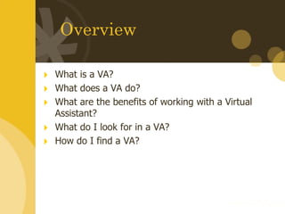 A virtual assistant (VA) is an independent entrepreneur offering administrative, creative, and technical services remotely on a contractual basis. Utilizing modern technology, VAs help various clients, including small businesses and executives, while providing benefits such as cost savings on payroll and office space. To find a suitable VA, one should consider expertise, certifications, and availability and can explore directories or submit requests for proposals.