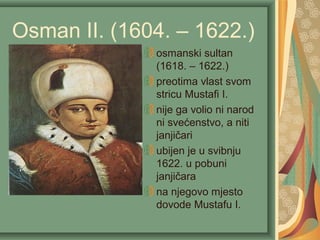 Ivan Gundulić u svom djelu 'Osman' prikazuje osmanskog sultana Osman II. koji preuzima vlast od strica Mustafe I. te se suočava s unutarnjim sukobima i pobunama. Kroz historijski ep, Gundulić istražuje teme oholosti, vlasti i sudbine, dok se radnja vrti oko mirnog sporazuma s Poljskom i borbe ratnica. Delo završava simbolikom svrgavanja sultana kao posljedice njegove pohlepe i oholosti, sugerirajući početak kraja Osmanlijskog Carstva.