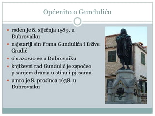 Ivan Gundulić, rođen 8. siječnja 1589. u Dubrovniku, pionir je hrvatske književnosti poznat po dramama i epovima poput 'Dubravke', koja se bavi ljubavlju i društvenim nepravdama, te 'Osman', povijesno-romantičnom epom o turskim vojnama. Njegov rad odražava alegorijske teme i kritiku društvenih odnosa, posebno nejednakih brakova između plemstva i građanske klase. Umro je 8. prosinca 1638. u Dubrovniku, ostavljajući značajan utjecaj na hrvatsku književnost.