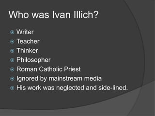 Ivan Illich was an Austrian philosopher, Catholic priest, and writer who criticized modern institutions and technologies. He was born in 1926 in Vienna and studied in several European cities before becoming a priest and moving to the US. Illich later left the priesthood and moved to Mexico, where he established an intercultural research center. He wrote several influential books critiquing issues like education, medicine, and technology. Illich argued that institutions often end up serving purposes opposite of their original intentions and advocated for more convivial and decentralized systems. He died in 2002 in Germany.