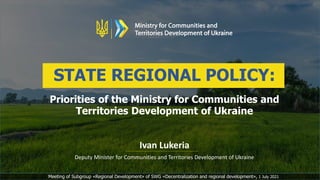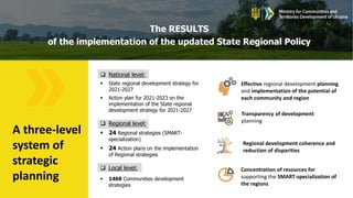 The document summarizes the priorities of Ukraine's Ministry for Communities and Territories Development. It outlines a three-level system of strategic planning at the national, regional, and local levels. Some key priorities include developing 24 regional strategies, over 1,400 community development strategies, and concentrating resources to support regions' smart specializations. The results of implementing an updated state regional policy would include more effective planning, development and use of each region's potential, and reduced disparities between regions.