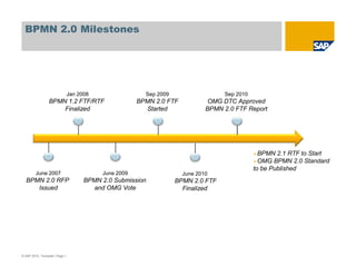 This document summarizes the key milestones in the development of BPMN 2.0 from 2007 to 2010. It outlines the new capabilities in BPMN 2.0, including a formalized metamodel, refined execution semantics, and new elements. It describes the business value of BPMN 2.0 in simplifying end-user processes and enabling portability. It also outlines the different conformance classes for tools supporting process modeling, execution, BPEL execution, and choreography. Finally, it discusses challenges in testing compliance and possible improvements to the conformance framework.