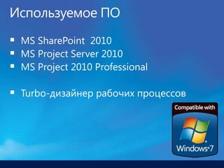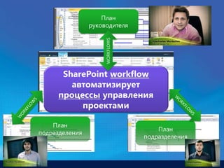 Документ обсуждает интеграцию SharePoint и Project, указывая на преимущества их совместного использования. Пользователи создают формы в InfoPath и проектируют рабочие процессы, которые могут быть загружены и просмотрены на SharePoint. Это улучшает управление процессами и их историю.