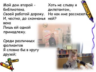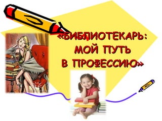 Документ описывает путь человека к профессии библиотекаря, начиная с детских мечтаний и заканчивая реализацией этой мечты. Автор делится своими чувствами к библиотеке и значению этой профессии для общества. Также упоминается о наследственности и вдохновении от близких родственников.
