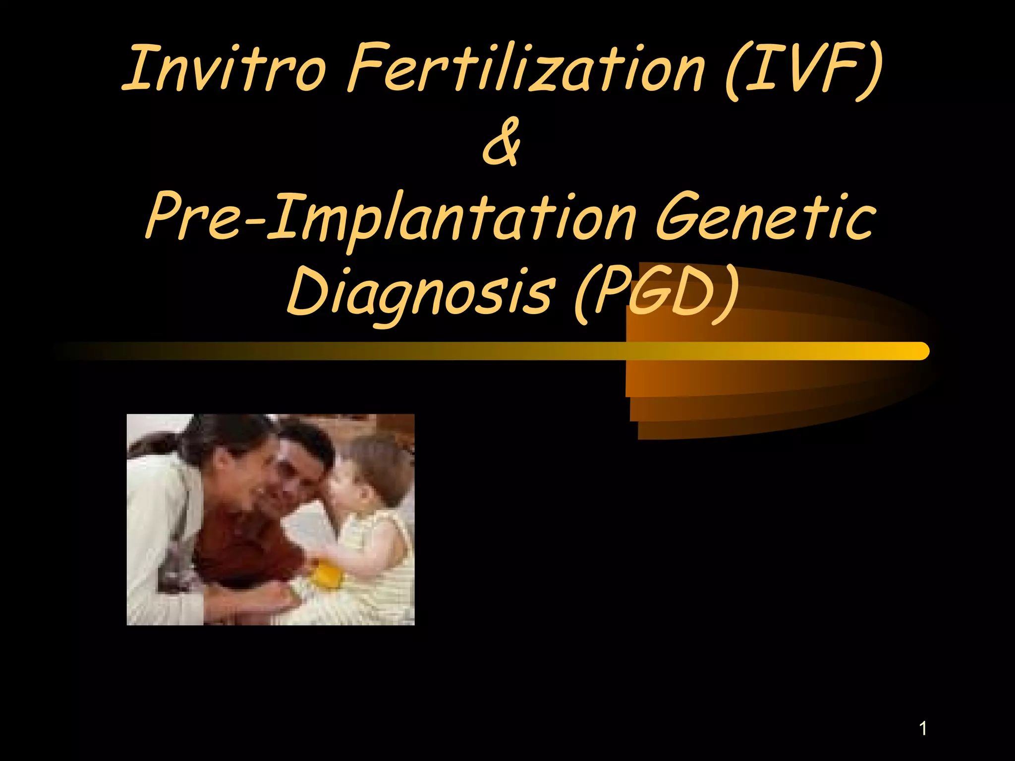 This document discusses invitro fertilization (IVF) and pre-implantation genetic diagnosis (PGD). PGD involves testing embryos for genetic diseases prior to implantation. It can reduce miscarriage rates and allow parents to select embryos without diseases. However, it also enables selection for non-medical traits and rejection of embryos deemed "undesirable," raising ethical issues around eugenics, discrimination, and defining moral status of embryos. The document examines perspectives from various worldviews including rights ethics, utilitarianism, religion, and law on matters concerning IVF, PGD, embryo research, and genetic selection.