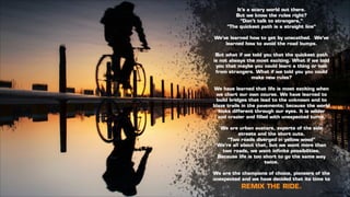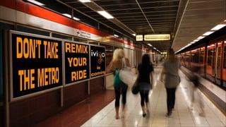 The document discusses plans for an urban transport network called ivigo. It will redefine commutes by pushing boundaries through collaboration. Ivigo aims to engage and surprise users, viewing people as active participants rather than passive media receivers. The network symbolizes community and getting people on the move, with the name "ivigo" combining "vigo" meaning community and "go" representing adventurers. It will highlight unexpected journeys of weekly trailblazing users to build a community of urban adventurers.