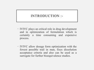 In vitro–in vivo correlation (IVIVC) is vital in drug development, enabling dosage form optimization while minimizing human testing and costs. It establishes a relationship between in vitro dissolution properties and in vivo responses, categorized into levels A, B, C, and D, each with varying predictive strength. The FDA emphasizes IVIVC's role in facilitating biowaivers and ensuring therapeutic product quality.