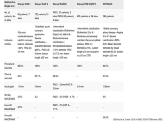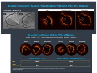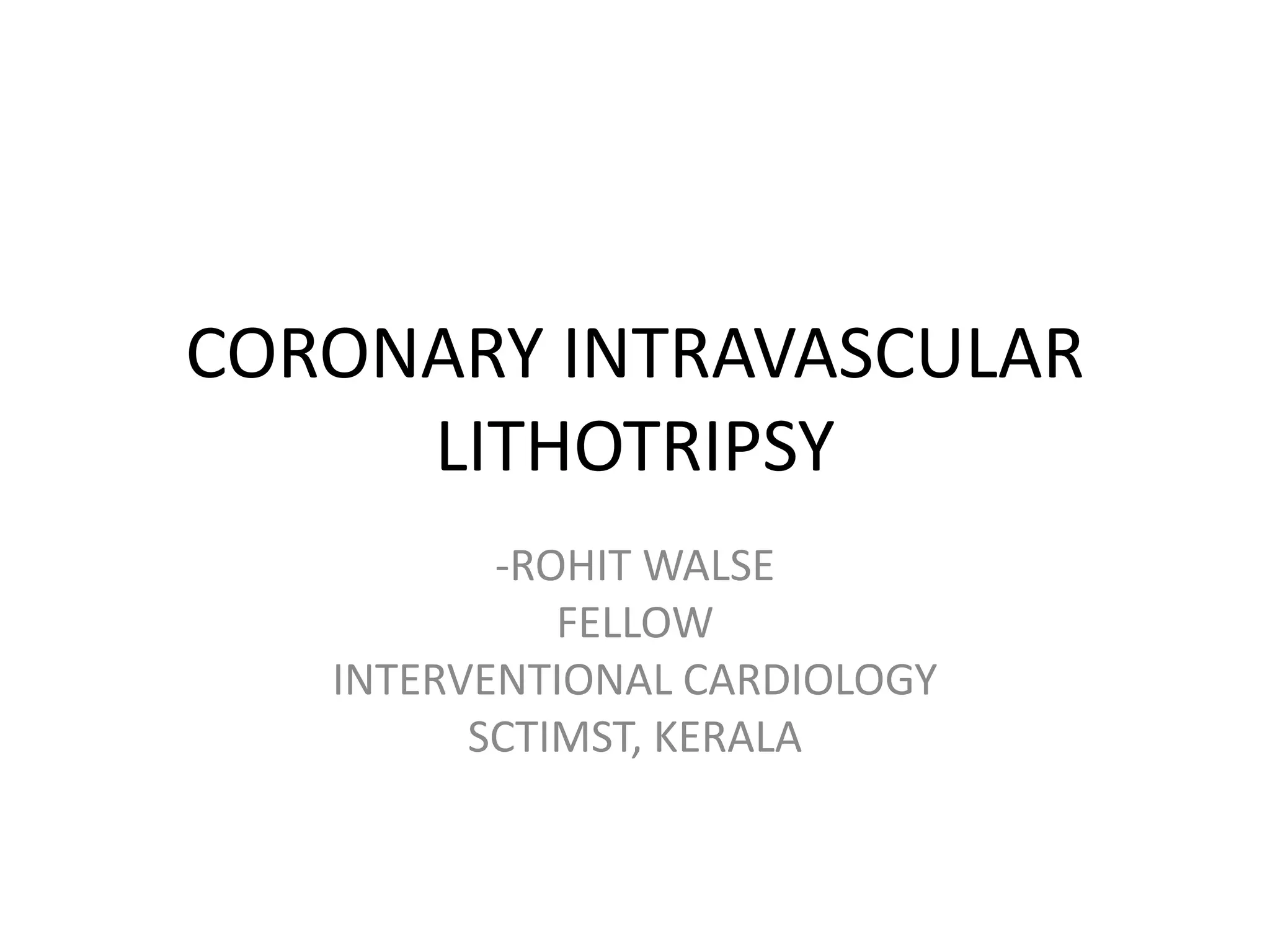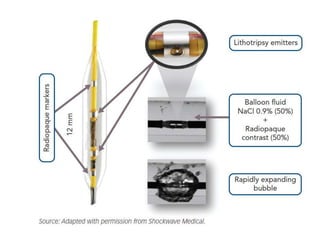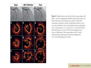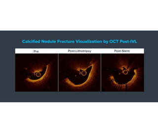 Coronary artery calcium predicts worse patient outcomes and is a challenge for stent placement. Lithotripsy uses sonic pressure waves to disrupt calcium and soften vessels, allowing improved stent expansion. Studies show lithotripsy modifies calcium safely with low risk of complications. It can treat calcium more effectively than atherectomy by impacting deeper, circumferential calcium and navigating tortuous anatomy while keeping wires in place. Lithotripsy may help improve outcomes for heavily calcified lesions.