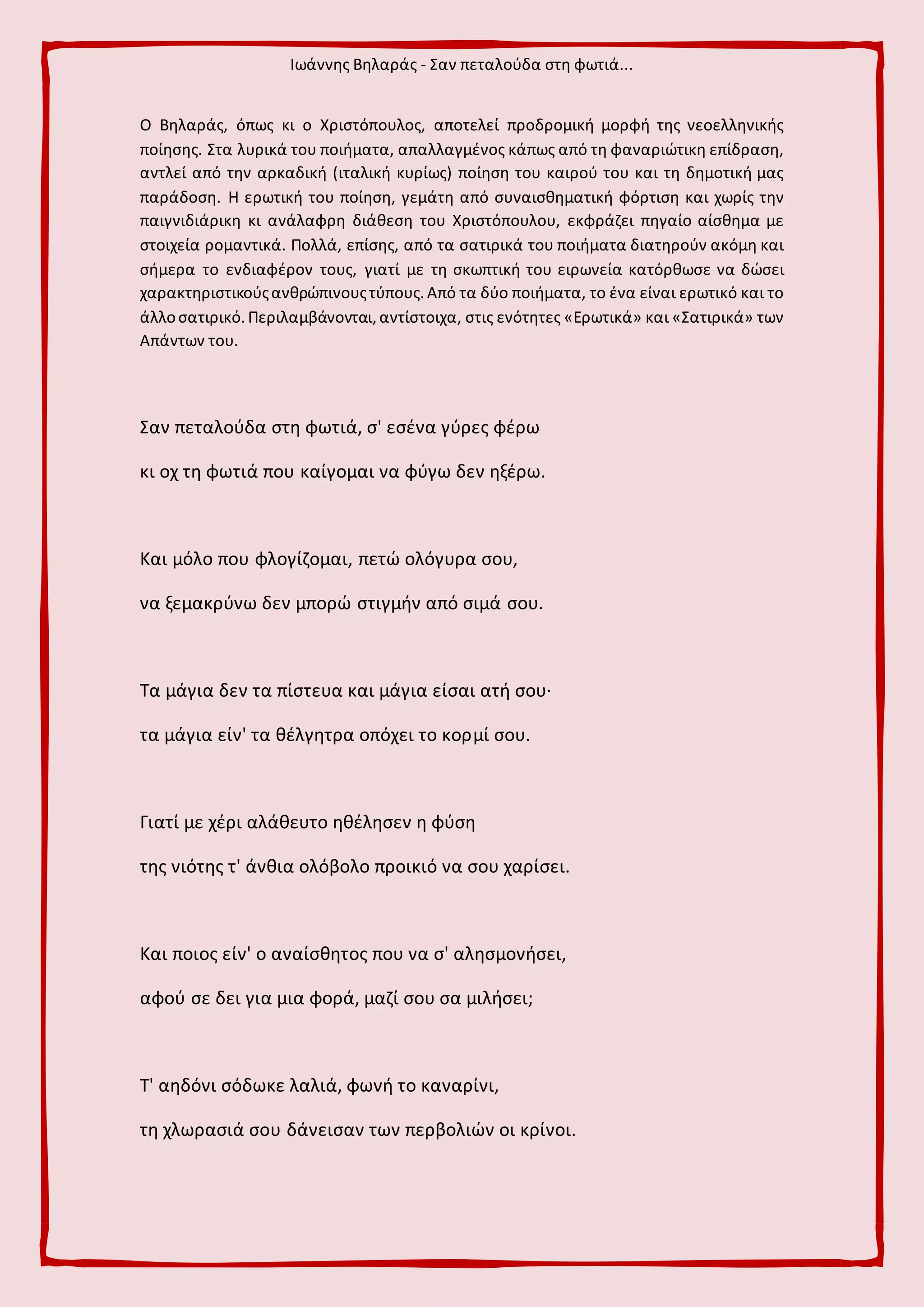 Ιωάννης Βηλαράς -Σαν πεταλούδα στη φωτιά...