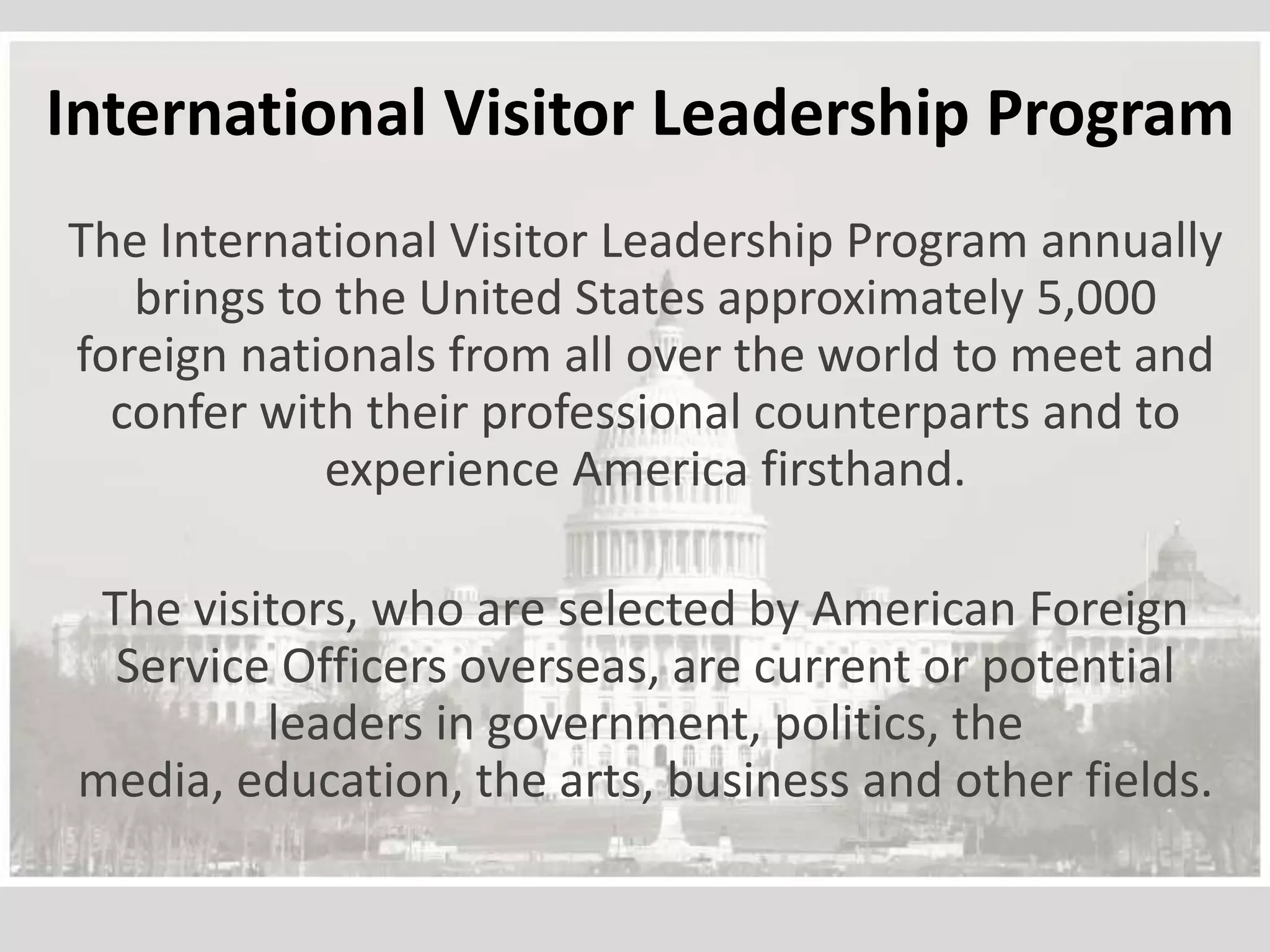 The International Visitor Leadership Program brings approximately 5,000 foreign leaders each year to meet with counterparts in the US to experience America firsthand. This year's program focuses on inspiring youth leadership and civic participation. 25 youth leaders from various countries will participate in a program traveling to Washington DC, Nashville, San Francisco, Cleveland, and New York. The itinerary includes meetings with organizations working in education, community development, and youth empowerment to learn about leadership skills, civic engagement, and social issues in the US.