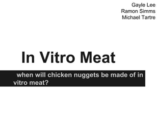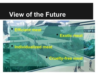 This document discusses in vitro meat (IVM), also known as cultured meat. It provides: